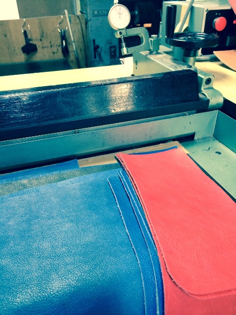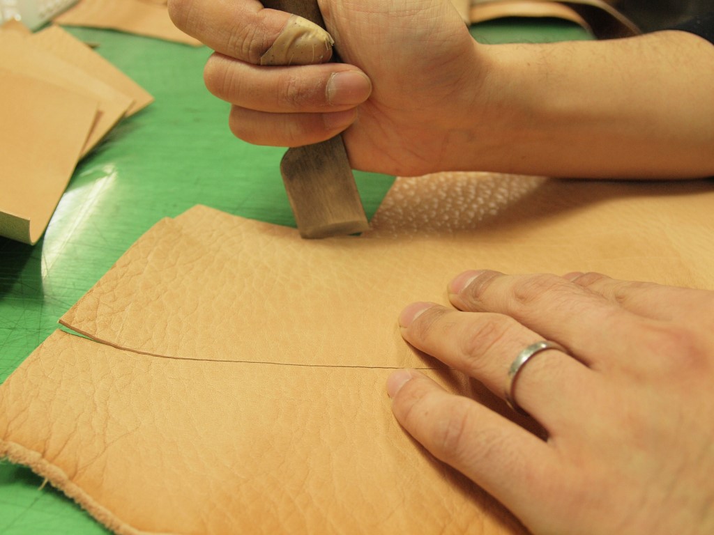 写真は、オーダー頂いたアイテムの革の厚みを整えるための漉きの作業。(パーツごとに設定した厚みに整える)